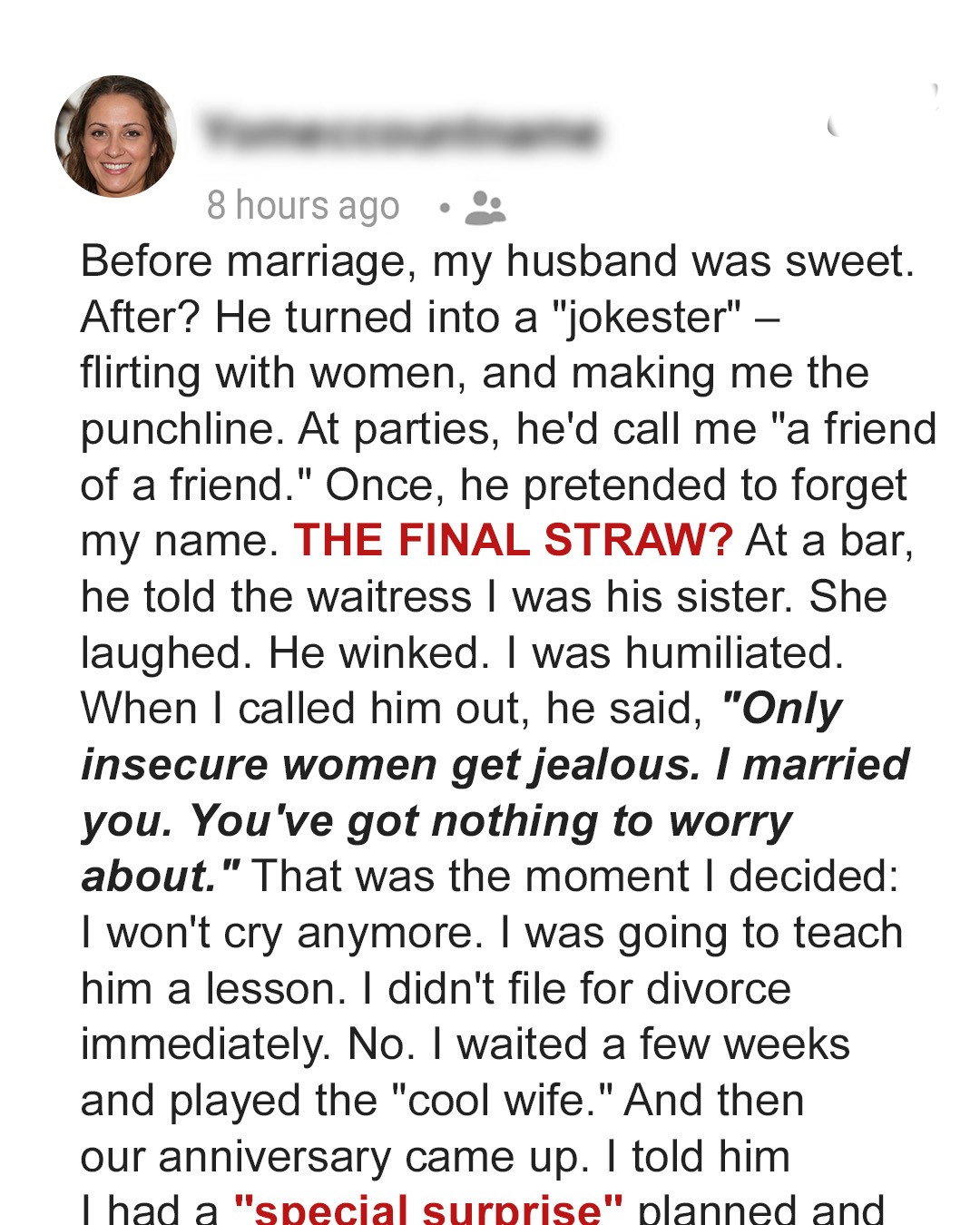 He used to adore her — until marriage made her the punchline. Public “jokes,” flirty games, and one brutal night at a bar pushed her past her limit. When he introduced her as his sister, she stopped crying and started planning a surprise he’d never laugh off.Dave used to be the man of my dreams.He used to sneak up behind me while dinner simmered on the stove, wrap his arms around my waist, and sway to whatever song was playing in his head.He was the man who once drove three hours through a thunderstorm just to surprise me with a slice of key lime pie from the little diner we discovered on our second date.