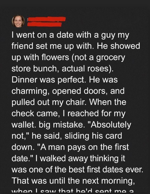 At first glance, Eric seemed like the leading man from a rom-com—sending thoughtful texts, surprising me with fresh roses, and displaying impeccable manners. Everything about him felt curated and deliberate, almost too good to be true. That illusion came crashing down the next morning when he emailed me a PDF. No, not a love letter or playlist—but an itemized invoice for our date, assigning emotional “charges” for things like roses, opening doors, and dinner, with a bold demand for “payment in full.”