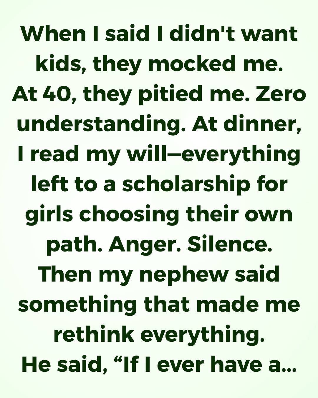Then, the largest portion, almost 90% of my considerable estate, goes to a foundation I’ve been quietly supporting for years. A foundation dedicated to providing scholarships and mentorship to young women pursuing advanced degrees in STEM fields, specifically those who have openly expressed their choice to prioritize their professional careers and live child-free lives.