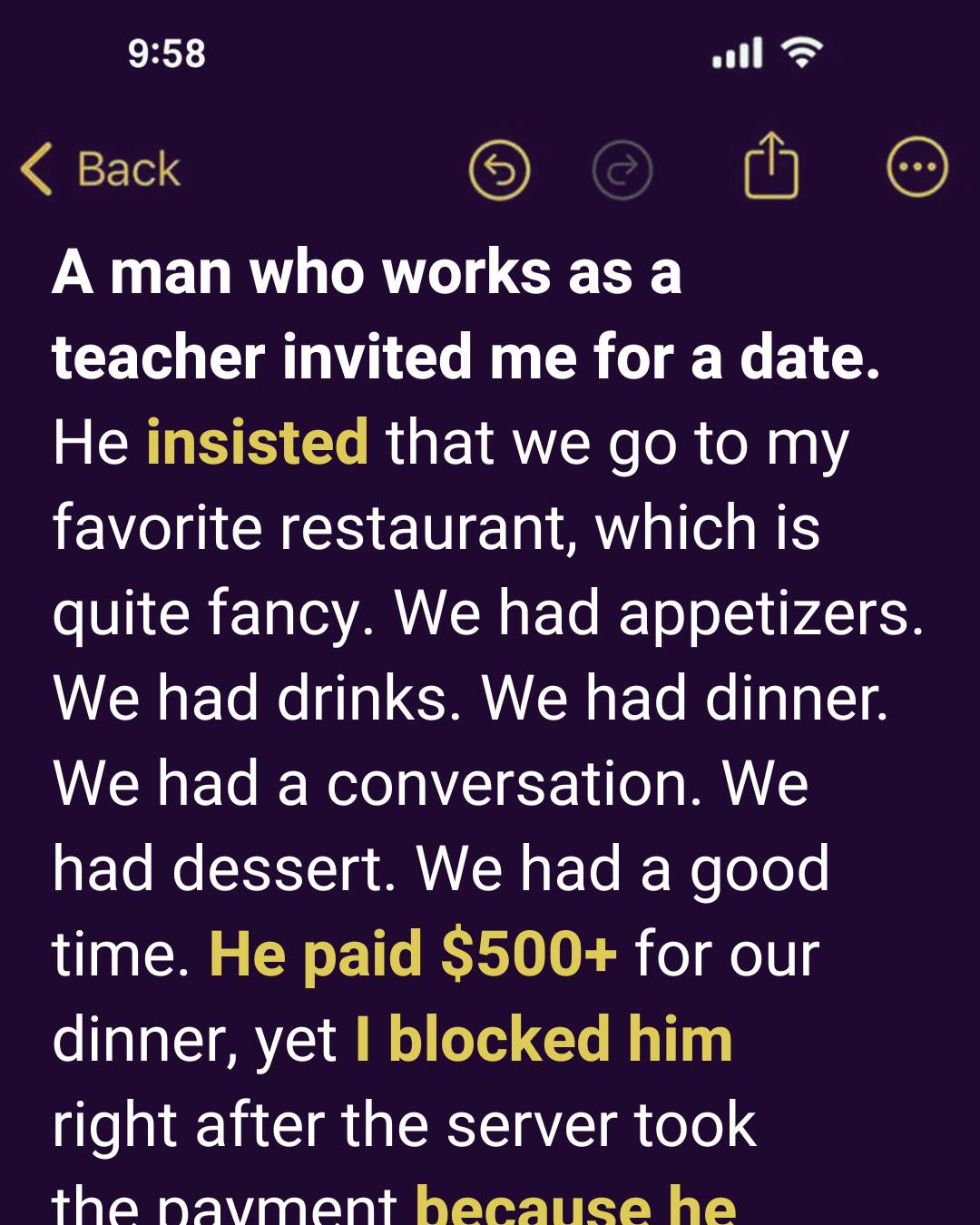Woman Cuts Off Date Immediately After He Pays for Their $500 Dinner—Here’s Why