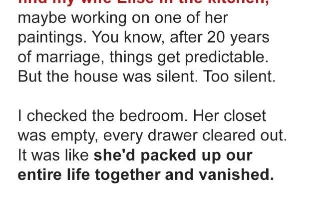 It was a Tuesday. Just a regular Tuesday. Twenty years, and I’d never once doubted we’d see a hundred more Tuesdays together. That’s the kind of love I thought we had. The kind that settles, comfortable and deep, like an old armchair by a warm fire. We had our routines, our inside jokes, our silent understanding that spoke volumes. Or so I thought.I came home, the usual clink of my keys, the automatic call of her name. “Honey, I’m home!” But there was no reply. No gentle rustle from the kitchen, no familiar scent of dinner simmering. Just silence. A cold, heavy silence that felt wrong, fundamentally wrong, in our house.