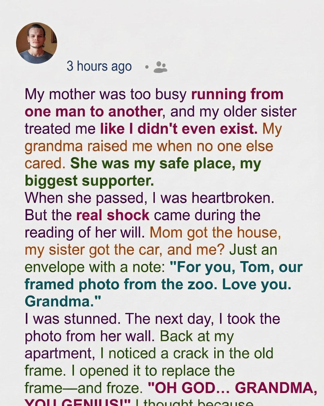 It’s been years now, but the ache in my chest still feels as fresh as the day it began. Some pains just don’t fade, they just… become a part of you. This one started with the rustle of papers, the solemn voice of an attorney, and a profound, public humiliation.My Grandma had passed, a quiet exit after a long, full life. She was the one constant, the softest touch, the quiet listener. I loved her fiercely. I thought she loved me back with the same intensity. So, when the family gathered for the reading of her will, a strange mix of grief and expectation filled the air. We were a close family, or so I thought. Cousins, siblings, aunts, uncles – all present. All waiting.