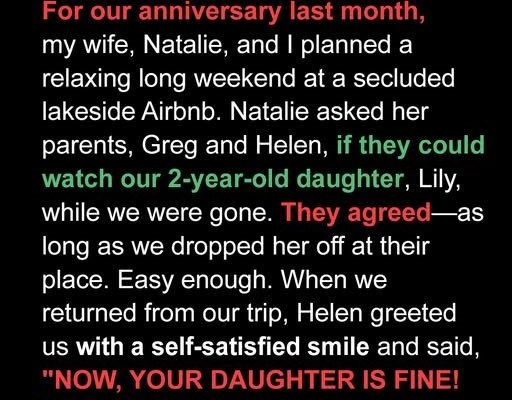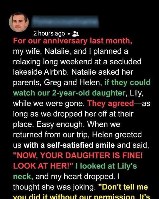 By 7 PM, I was in a full-blown PANIC ATTACK. My wife, trying to soothe me, finally admitted they’d taken her to their cabin, two hours away. WITHOUT ASKING. WITHOUT TELLING US. My blood ran cold. I demanded she call them and have them bring our daughter home immediately. The drive there felt like an eternity. My wife was quiet, tense. When we finally pulled up to their remote cabin, the lights were off. My heart hammered against my ribs.