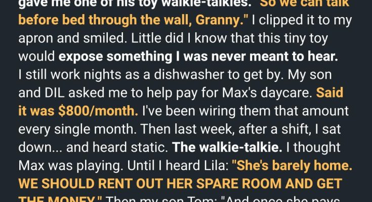 The silence of the house had become my constant companion since he left. A vast, echoing canyon of quiet, especially at night. It was a silence that wrapped around me, cold and suffocating, reminding me of what was missing, what I had lost.Then, a little voice, clear as a bell, cut through it all. “Grandma? Over and out.”My grandson. My sunshine. He was only seven, all gangly limbs and boundless energy, with a laugh that could chase away any shadow. He was the reason I woke up each morning, the pure, unadulterated joy in my solitary world. And he had a secret weapon against my loneliness: two cheap, bright red walkie-talkies.He’d snuck one into my hand one evening, his eyes wide and conspiratorial. “For secret missions, Grandma,” he’d whispered, his little fingers pressing it into my palm. “When everyone else is asleep. Just us.”