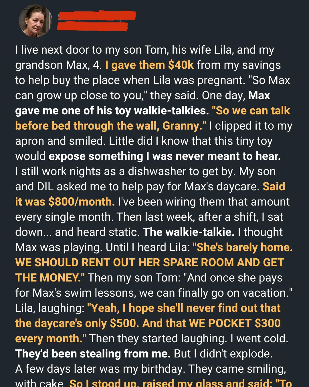 And my grandson. My sweet, innocent grandson. The boy who had given me the walkie-talkie, a symbol of our secret, honest bond. He had, unwittingly, handed me the instrument of my own undoing.
