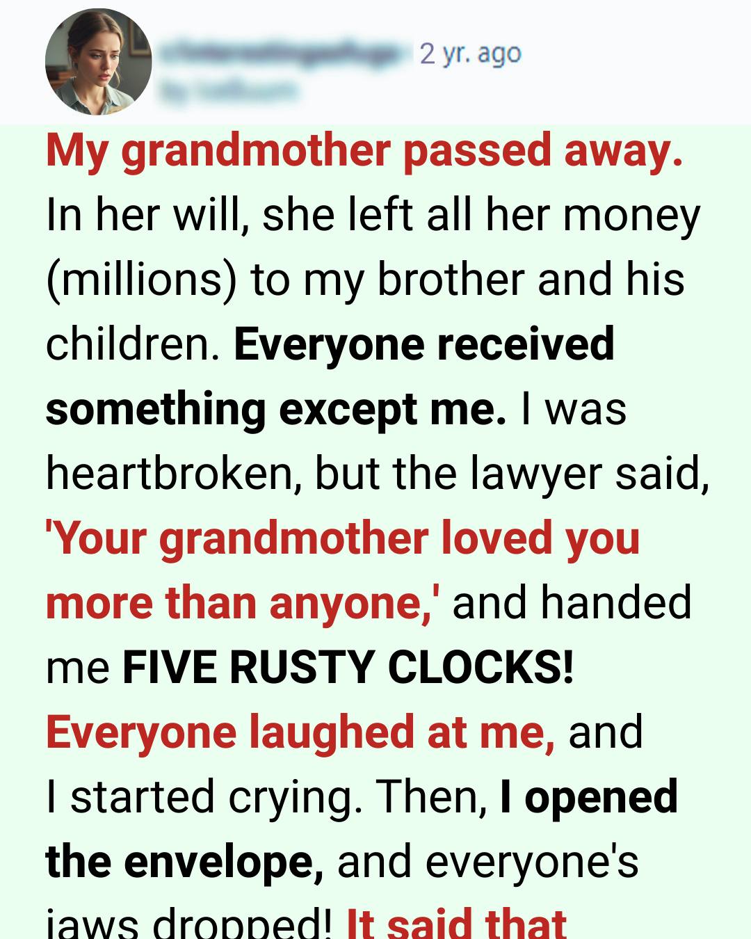 They Laughed When My Grandmother Left Me Five Rusty Clocks—Until I Opened the Envelope…