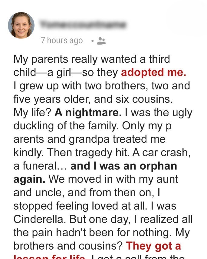 I stared at the screen, tears streaming down my face. The “cousin” who had relentlessly mocked me for being adopted, who had gleefully reminded me I was an outsider, she was my biological mother. My mother. And my “parents” were my grandparents. The family I thought had taken me in out of charity, out of kindness, had instead covered up a scandal. My entire life, I had been raised believing I was an outsider, when in reality, I was their deepest, darkest secret.