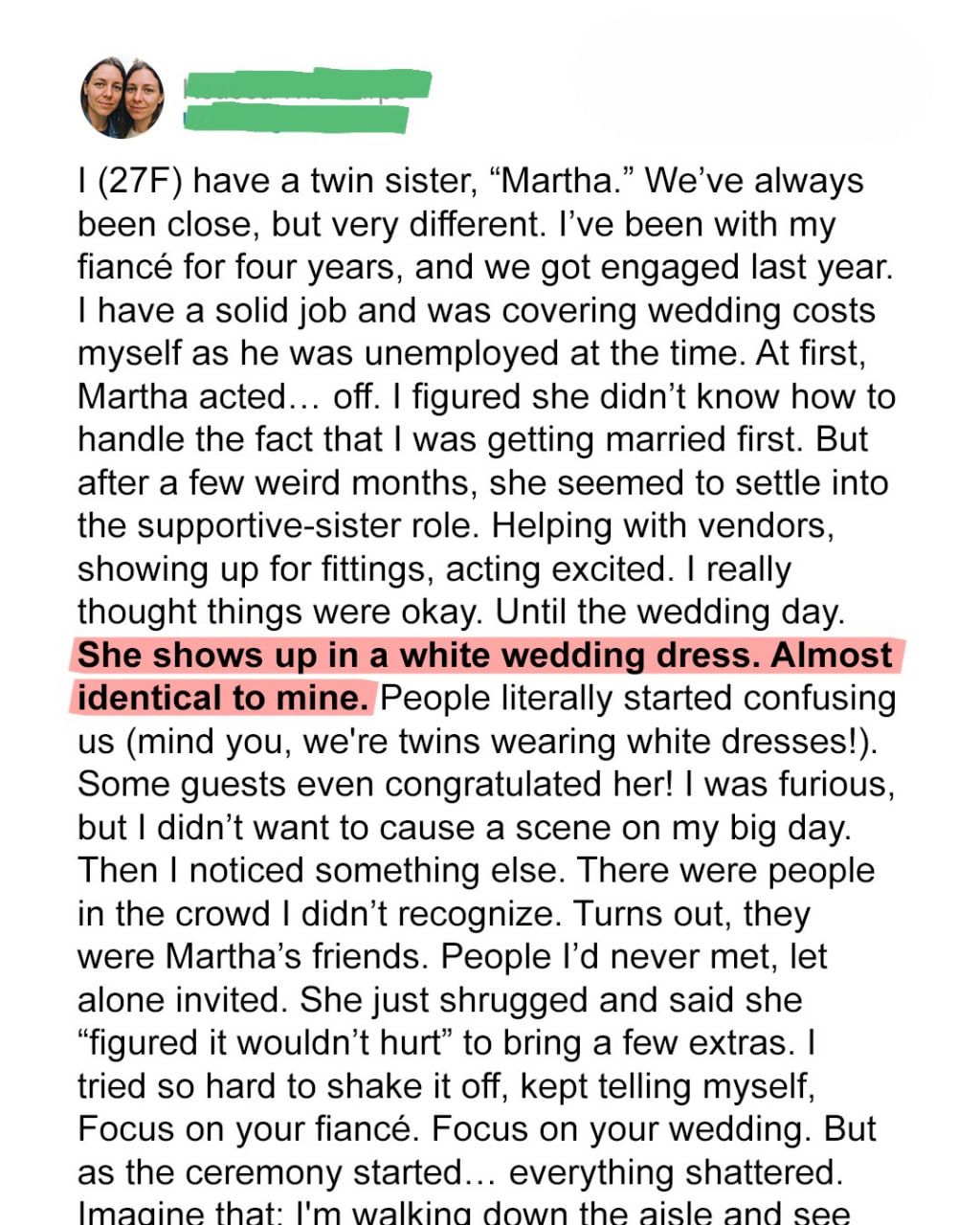 We’d always been close, but she started acting strange as soon as I announced the news. When I’d show her wedding magazines or talk about dress shopping, she’d get this weird look on her face.
