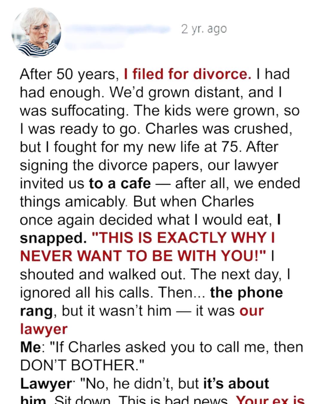 After fifty years of marriage, I asked for a divorce.The words felt heavy, alien on my tongue, even though they’d been forming in my mind for over a decade. Fifty years. Half a century. It sounded like an eternity, but it felt like a slow, quiet suffocation. We built a life, a home, raised children who now had children of their own. From the outside, we were the picture of stability, the enduring couple. But inside, I was screaming.For years, I’d felt a profound emptiness. Not a void created by conflict, but by absence. He was there, always. In the morning, at dinner, beside me in bed. But he wasn’t with me.