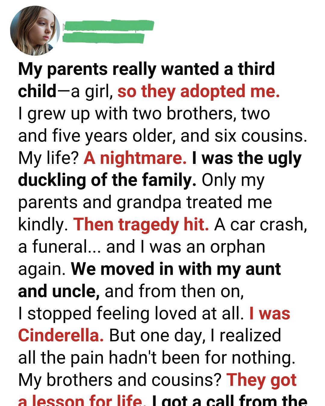 I always felt like I was visiting. Not living. Just… visiting. From the moment I could understand, I knew I was different. Not in a special way, but in a lesser way. My ‘aunt’ and ‘uncle’ were kind enough, I suppose. They fed me, clothed me, gave me a roof. But it was always with a subtle sigh, a strained smile, a feeling of duty, never delight.Their own children, my ‘cousins,’ were showered with love. Birthday parties, late-night talks, easy laughter. I watched, a ghost at the feast. My older ‘cousin,’ Sarah, was the golden child. Beautiful, clever, adored. I admired her, even idolized her, but there was always this tiny, bitter knot in my stomach when I saw the way my aunt looked at her. Pure, unadulterated love. A look I never received.