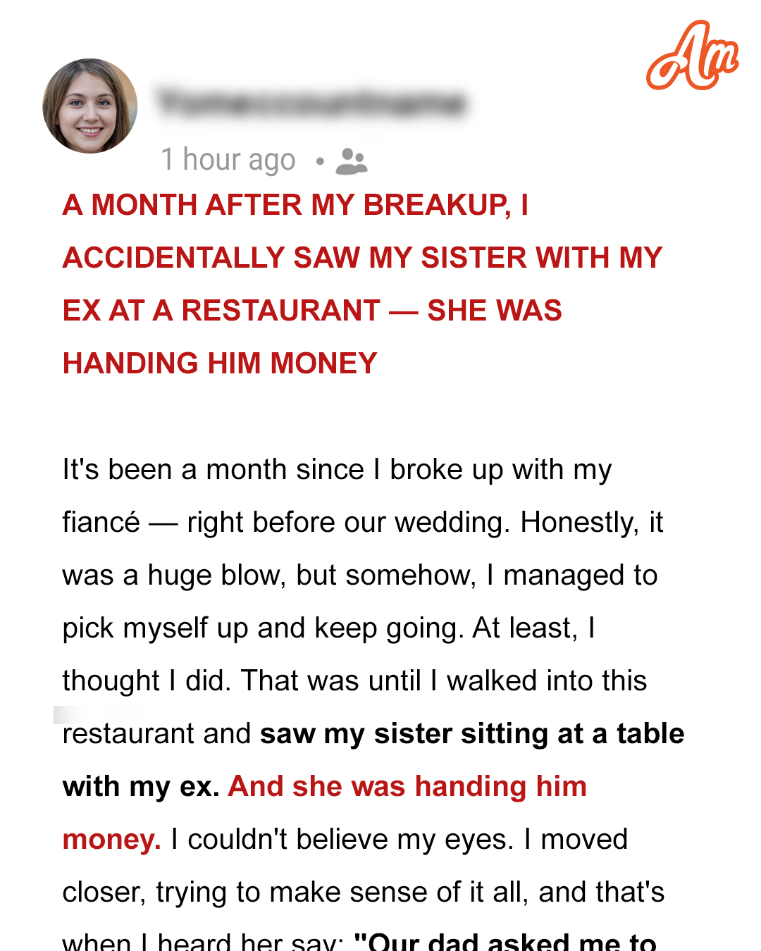 A Month After My Breakup, I Accidentally Saw My Sister with My Ex at a Restaurant — She Was Handing Him Money