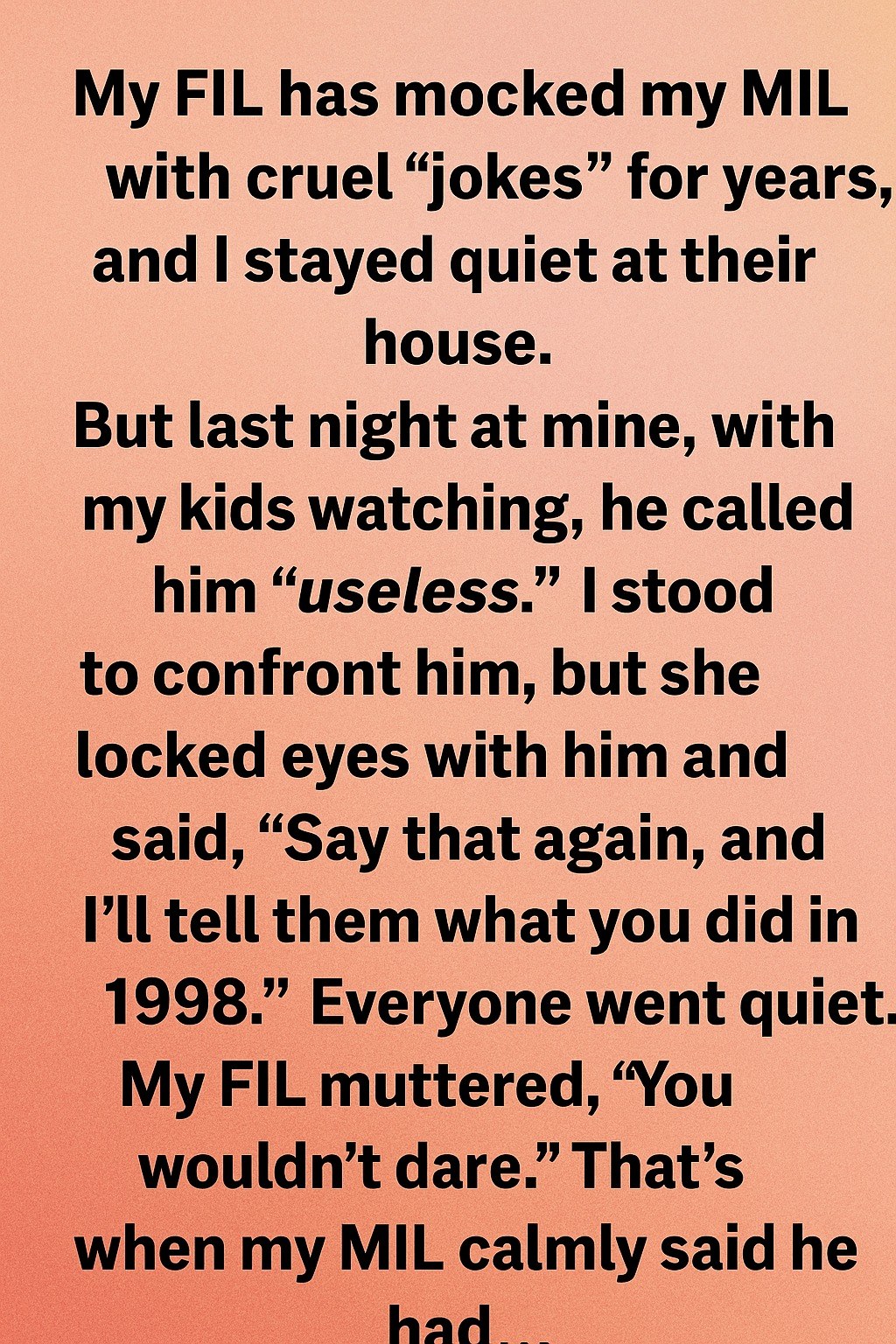 I didn’t explain. I didn’t point fingers. I didn’t defend. I just… owned it. And in that moment, by taking the blow head-on, by offering no resistance, I rendered their weapons useless. They had prepared for a fight, and I had simply… surrendered. But it wasn’t a surrender to them. It was a surrender to an infinitely more profound, heartbreaking truth.