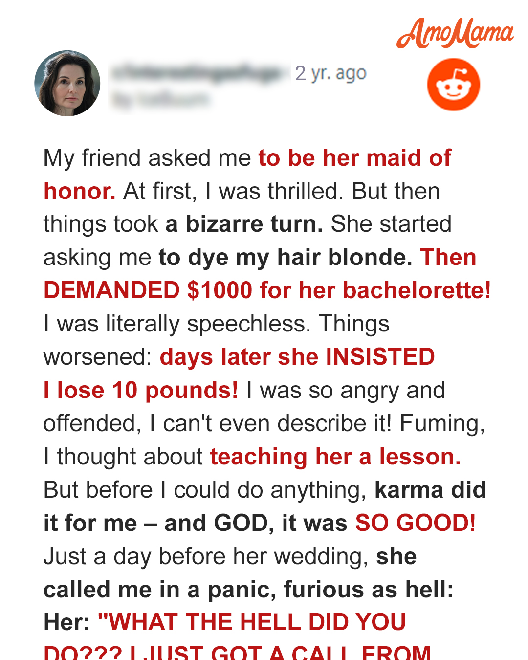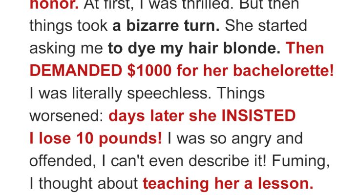 She started oddly, asking me to dye my hair blonde, then demanded $1000 for her bachelorette. I was shocked but things worsened when she insisted I lose 10 pounds. I was taken aback by her demand.