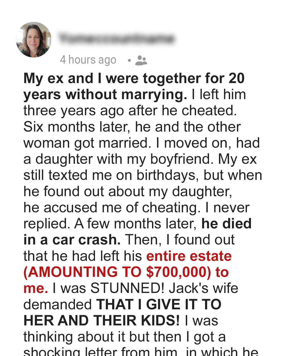 As I ponder these questions, I find myself seeking not just validation but understanding. Was keeping the inheritance the right decision, or should I have considered a different path, one that might have eased the grief and anger of those Jack left in his wake? In navigating this complex web of emotions and obligations, I’m left wondering if the path I chose was truly the best, not just for me and my family, but for the memory of a man whose final act was to give me everything.