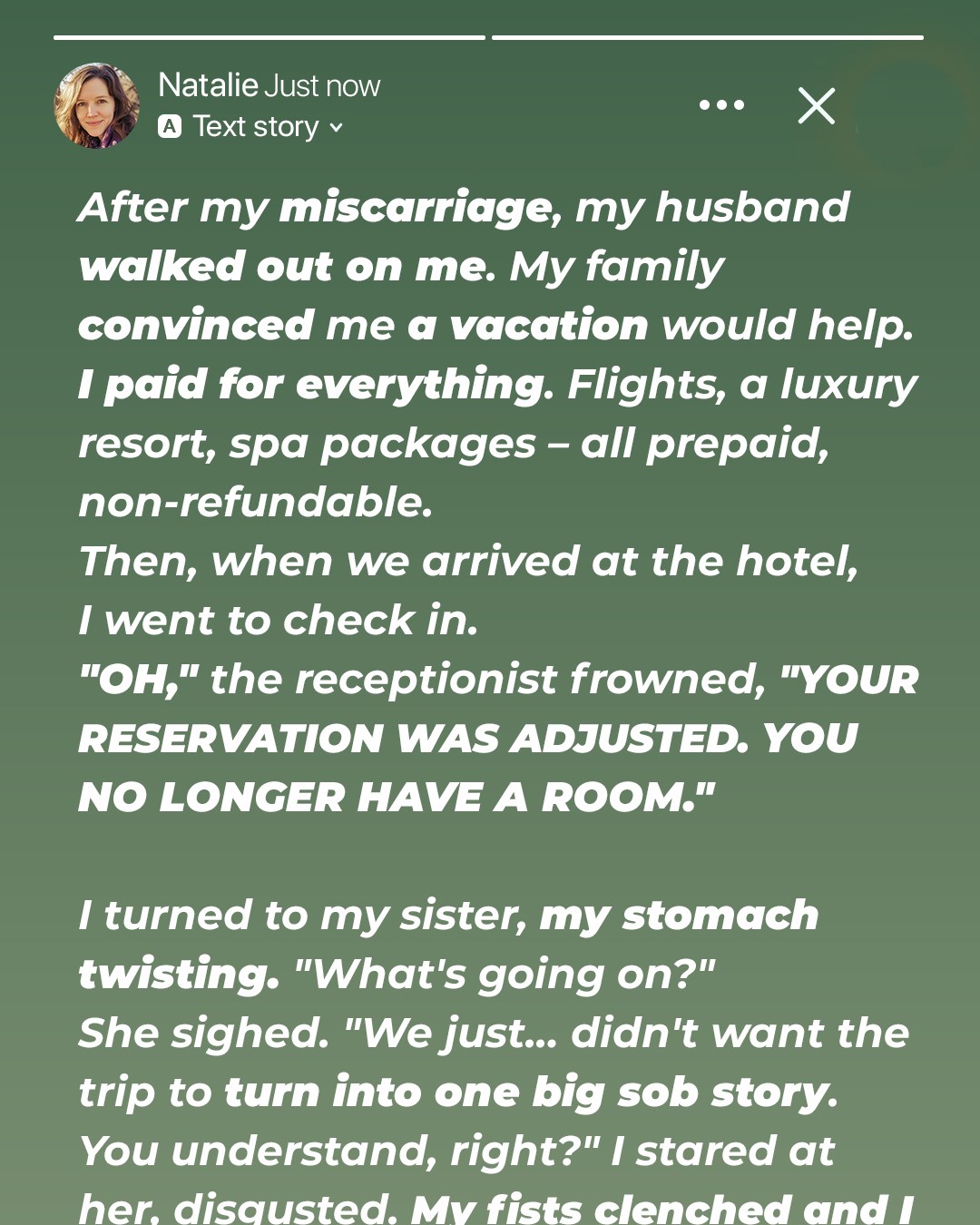 After a miscarriage, my family convinced me to take a luxury vacation to heal. But when we arrived, my room was gone — canceled using my account. Their excuse? “We didn’t want your grief killing the vibe.” They didn’t know this would be the last time they messed with me.I never expected my family to be there for me when Jake walked out.Three days after the miscarriage, he packed his bags and mumbled something about needing space. My husband left me alone with nothing but my loss.The first week was a blur.I moved through our apartment like a ghost, touching his things, wondering if anything had ever been real.