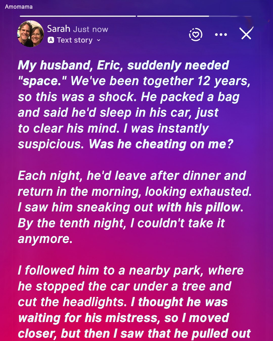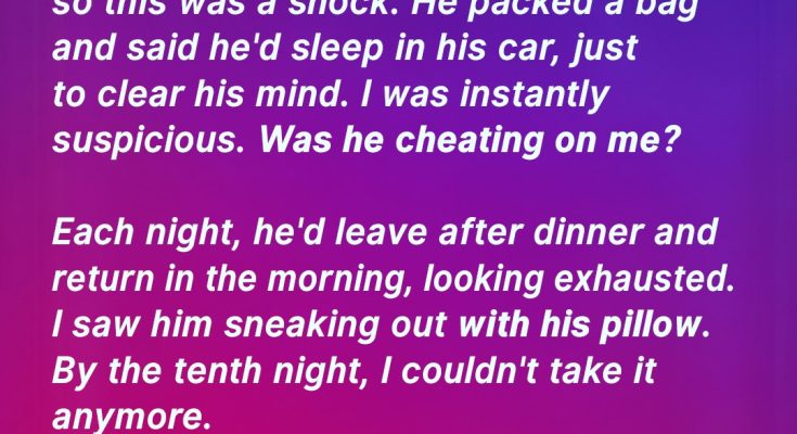 When Nella notices her husband, Eric, acting a bit strange, she follows him to see where he goes off to. A few nights into this new routine, she decides to just ask him the truth. But the truth is deeper and darker than Nella could have expected. And it changes her life forever…It all started when my husband, Eric, told me he needed some space to think things through.We’ve been married for 12 years, and while we’ve had our share of ups and downs, this was the first time he’d ever said something like that.“It’s not about us, Nella,” he insisted. “I just need time to clear my head.”But of course, my mind went to the worst possible place.Eric was always the steady one in our marriage. He was reliable, grounded, and calm. So, when he packed a bag and casually mentioned that he would be sleeping in his car for a few nights, my anxiety went into overdrive.