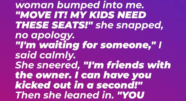 “Are you deaf?” She sneered, grabbing the back of the chair with perfectly manicured nails. Her voice dripped with condescension. “I said we need these seats. Now move.”
