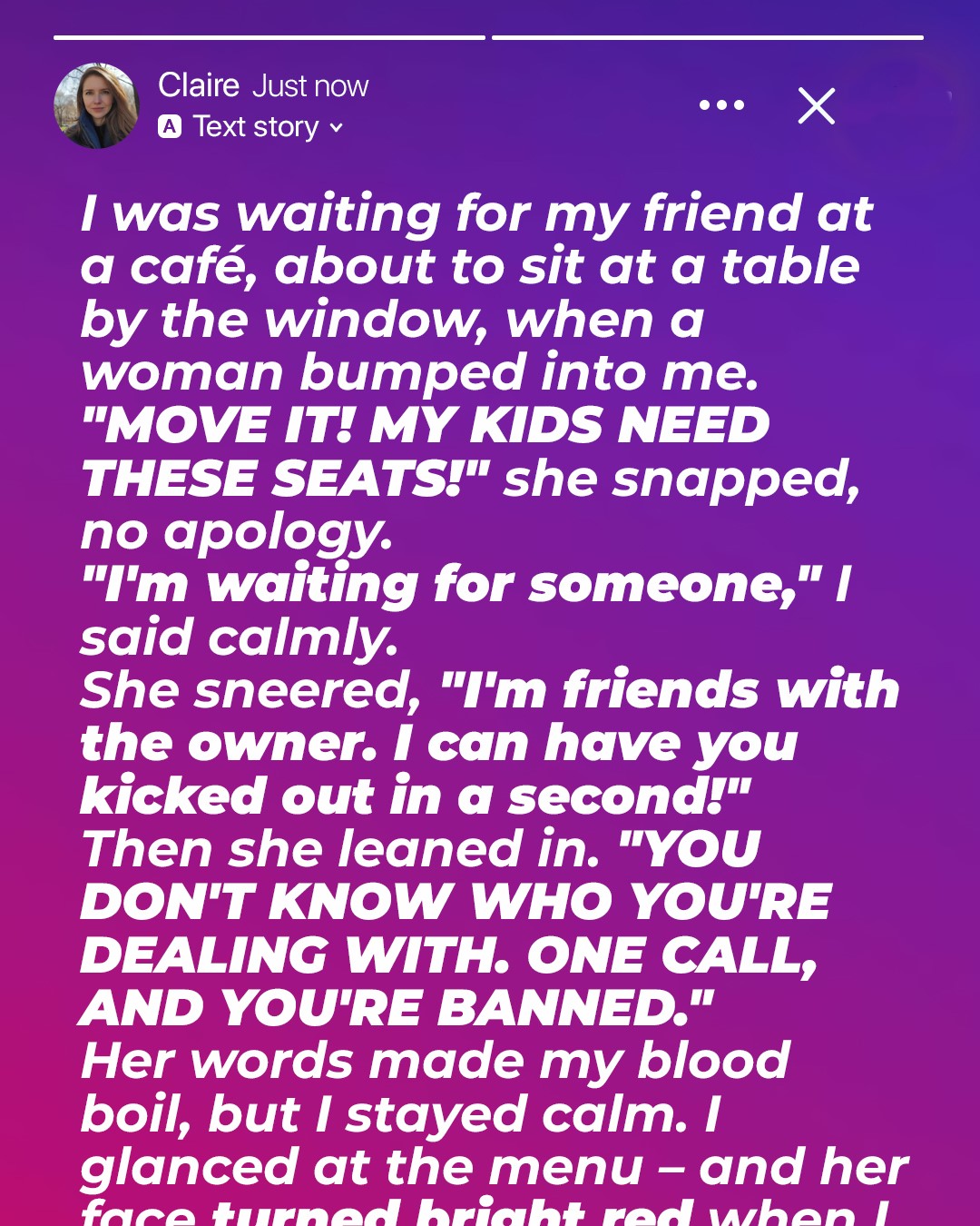 I blinked, taken aback by her tone. Who did this woman think she was? I glanced at her children, a boy and a girl, both looking more embarrassed than hungry. “I understand, but I got to this table first. There are other seats available—”