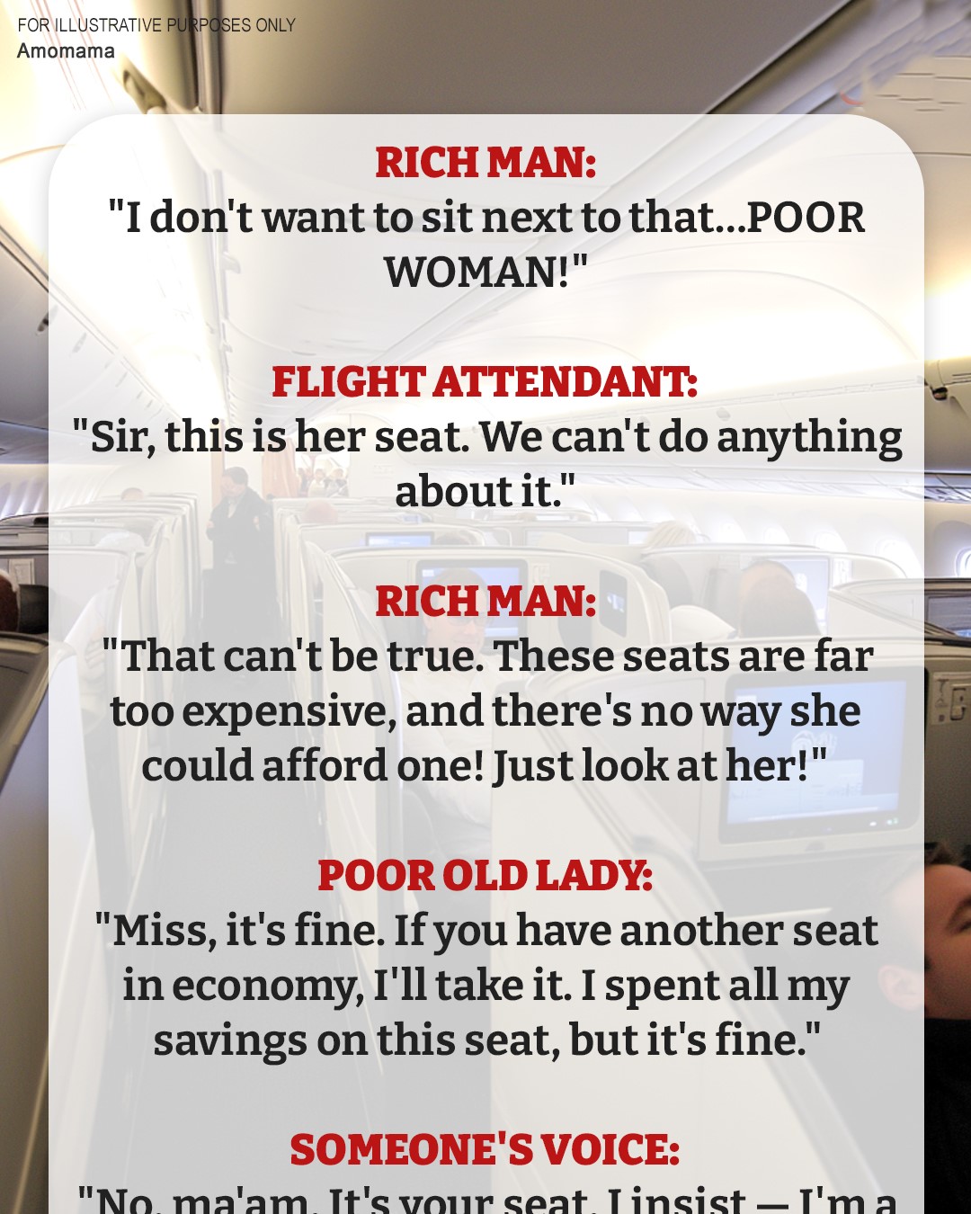 “Miss, it’s ok. If you have another seat in economy, I’ll stay there. I spent all my savings on this seat, but it’s better not to inconvenience others,” she said, placing her hand on the stewardess’ arm gently.