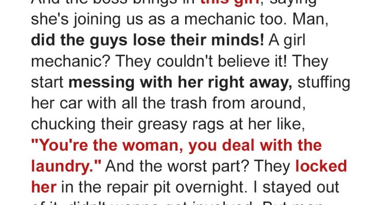 “I spent last night locked in your repair pit, reflecting on whether I wanted to remain in this industry or not. But then I remembered why I chose this path: because I believe women belong in auto shops if they so choose. So, I’m not only staying, but I’m also determined to run this place one day. Those pranks? They end now.”