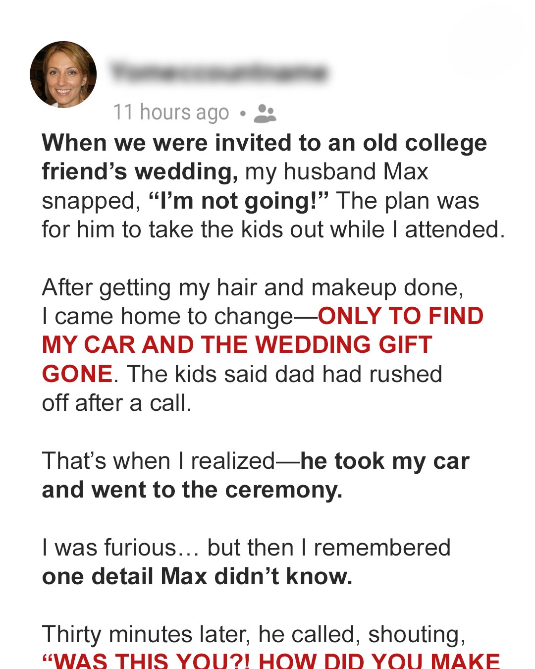 I didn’t know whether to scream or cry. He’d taken MY CAR, ditched OUR KIDS, and gone to the wedding he’d REFUSED to attend. And he hadn’t even bothered to text me.