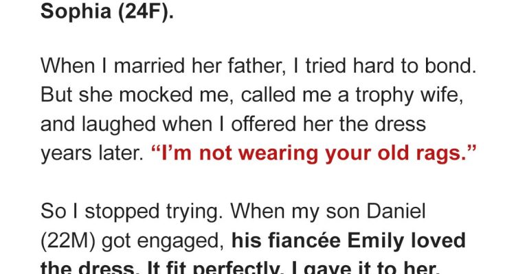 When I offered my heirloom wedding dress to my stepdaughter, she laughed in my face. She called it “old rags” and mocked the sentiment behind it. But the moment she saw someone else wearing it… suddenly, she wanted it for herself.Some things in life are irreplaceable. My vintage wedding dress is one of them. That’s why I preserved it… not in a dusty box under the bed, but displayed like the treasure it was—a vintage, hand-stitched lace gown from the early 1900s, lined with pearls so delicate you’d swear they could melt. My grandmother wore it. Then my mother. And then me…