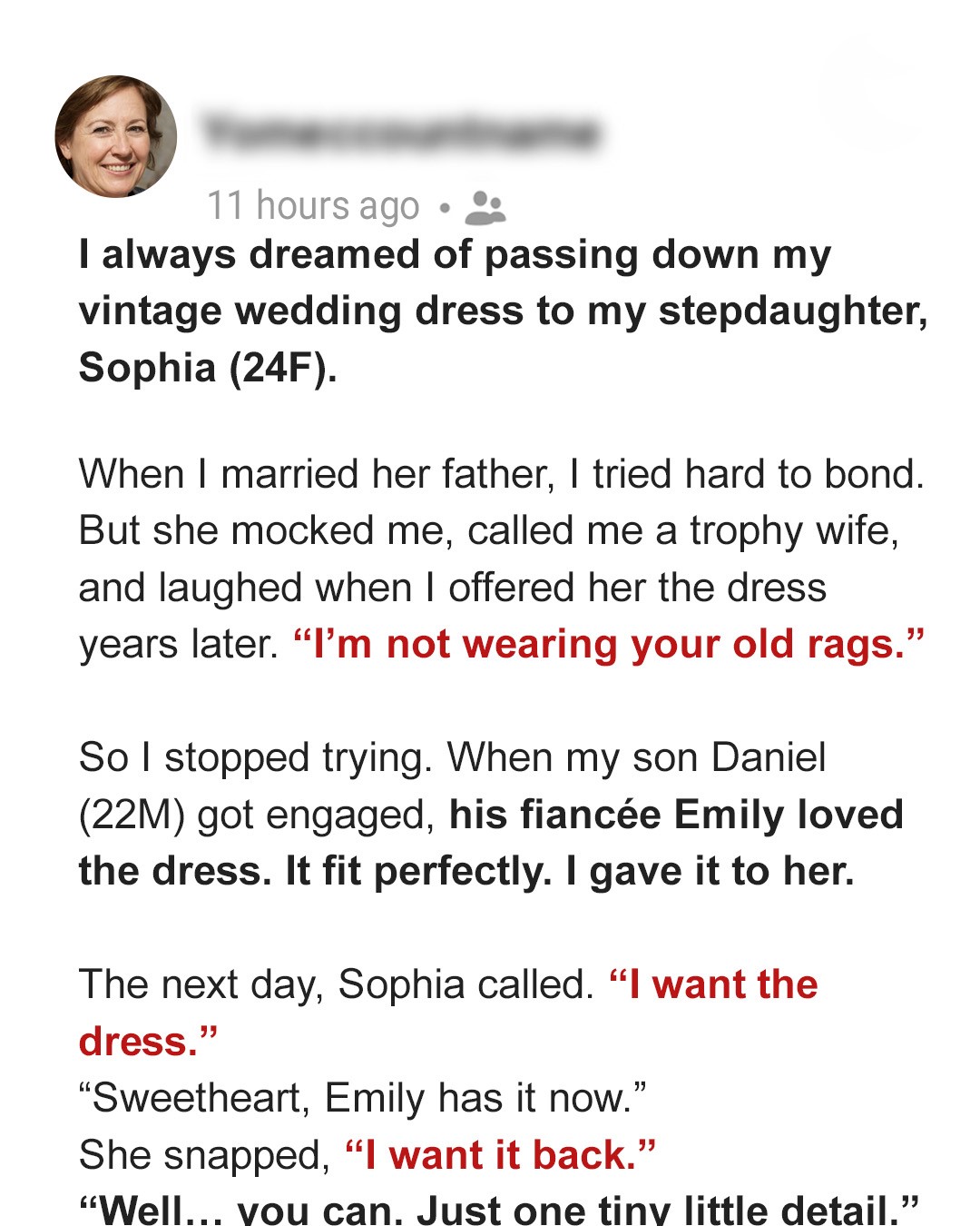 I took a deep breath, gathering my composure. “Well, actually, you can have it… but with one tiny little detail. Emily already made her alterations, so if you want it, you’ll need to pay for the full cost to restore it to the original. Oh, and since it’s vintage couture, the restoration will cost around… $5,000.”