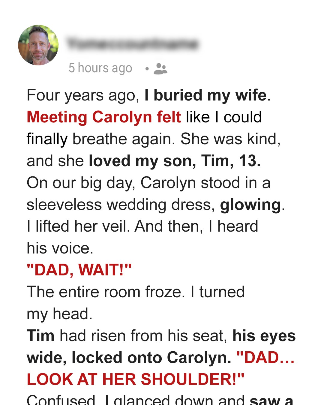 As I lifted my bride’s veil, ready to say “I do,” my son’s voice cut through the chapel. “Dad, wait! Look at her shoulder!” The room froze. Murmurs spread through the guests. My heart pounded as I followed his gaze — what could he have seen?Four years ago, I buried my wife, and with her, a part of myself. The funeral was a blur: black umbrellas against a gray sky, Tim’s small hand in mine, both of us trembling.I thought I’d never find happiness again. But life, as it tends to do, went on.When I met Carolyn, it was like I could breathe again. She was patient with my grief, understanding when I had bad days, and most importantly, she loved Tim.She never tried to replace his mother, but instead created her own space in his life.Tim, now 13, didn’t object to our relationship, but he wasn’t excited either.