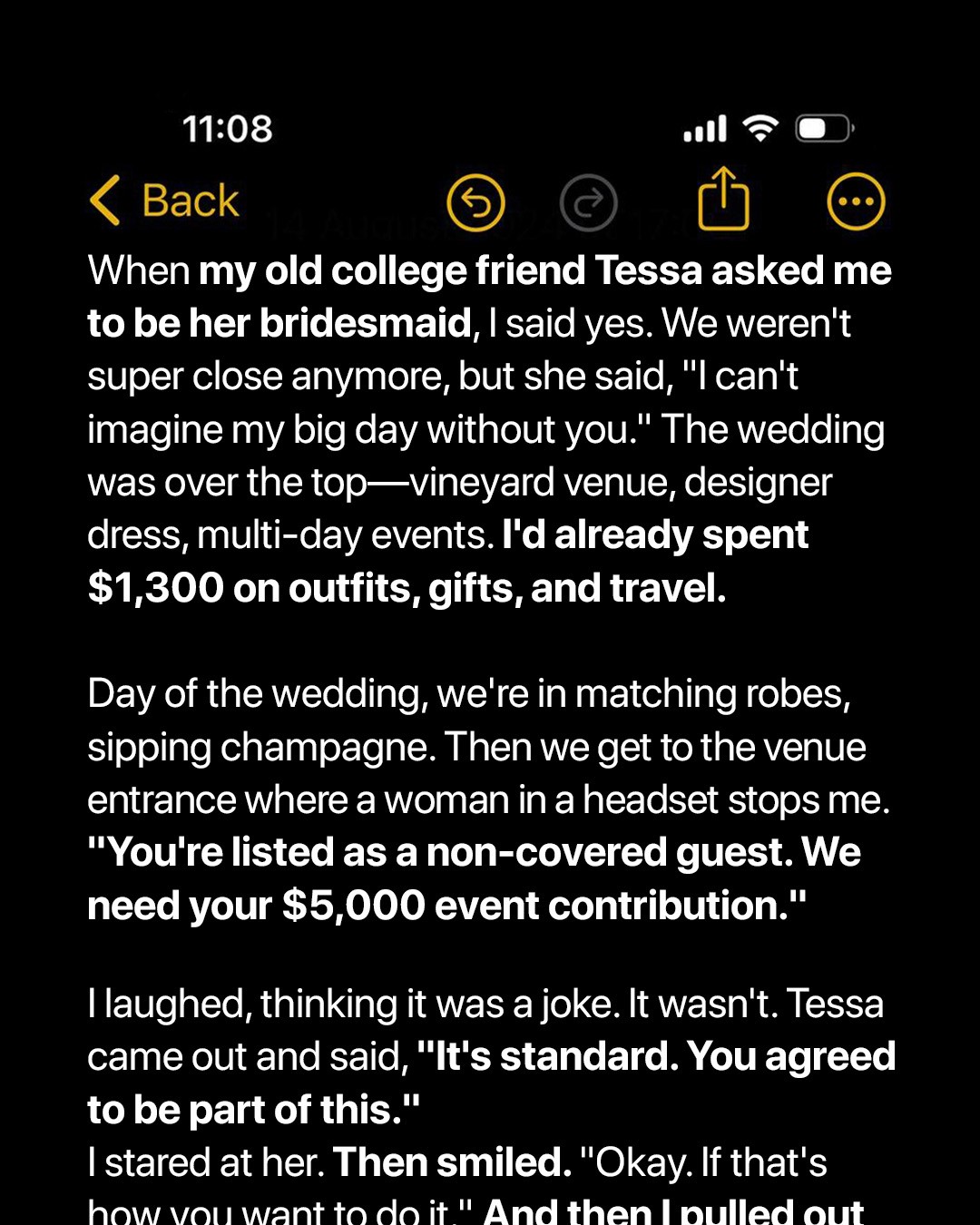 Then I wrote: “Just got hit with a $5,000 charge at the door to be a bridesmaid in a wedding I already spent $1,300 on… #WeddingShocker #CashOrCredit”
