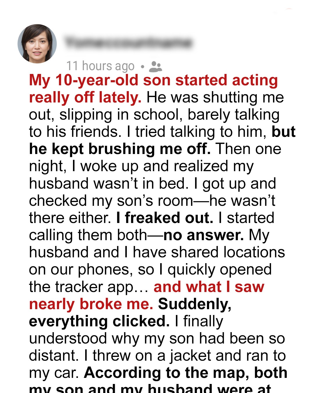 When my 10-year-old son started acting distant, I chalked it up to mood swings and figured it was just a phase. But one night, I woke up and realized he and my husband were both gone… and nothing could have prepared me for where I’d find them.There are moments that split your life in two: before and after. I’ve had a few of those: losing my first husband when my son was just a baby… and finding love again six months later.I’m Edith. I’m 35. And I have a son named Coby whom I love more than my own breath. His father died when Coby was just eight months old. A car crash. I barely remember that year. Just grief, formula bottles, and me sleepwalking through life.