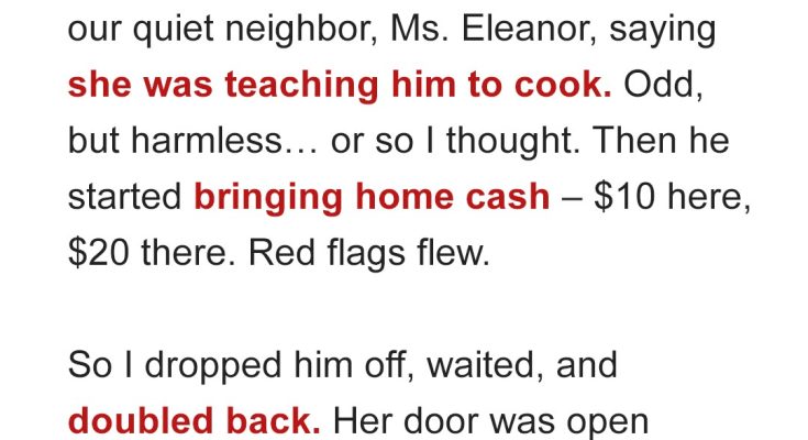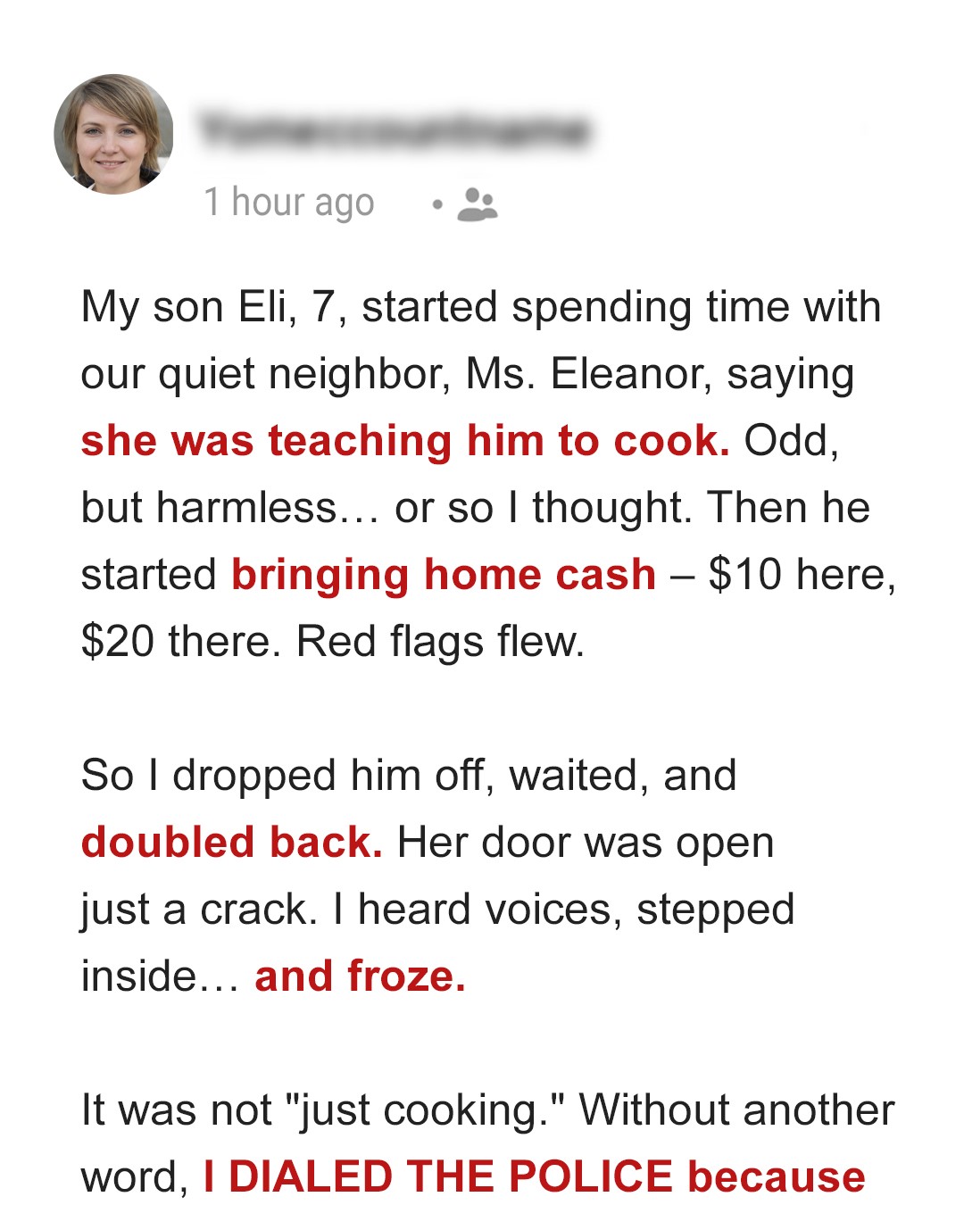 So, I sat down with him and kept my voice calm. “Eli, honey, I really need you to tell me what’s going on with Ms. Eleanor. Why does she keep giving you money? What’s happening at her house?”