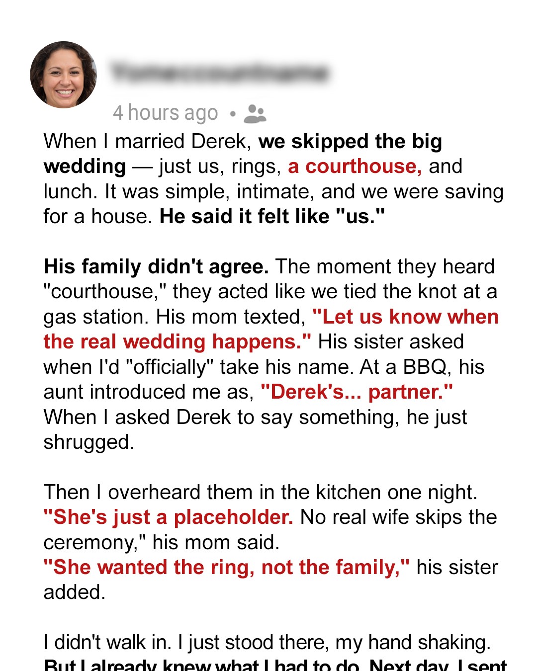 When Layla’s in-laws dismiss her courthouse marriage as “not real,” she plans a lavish reception to prove a point. But this isn’t a wedding, it’s an exit. As secrets unravel and power shifts, Layla steps into the spotlight one final time… not as a wife, but as a woman they’ll never forget.I never needed a wedding gown to feel like a bride.When Derek and I got married, we didn’t have cake tastings or linen samples or the clink of crystal under fairy lights. Instead, we had a courthouse clerk who barely looked up, two simple rings, and a quiet lunch afterward at a hole-in-the-wall bistro where the napkins didn’t match the silverware.