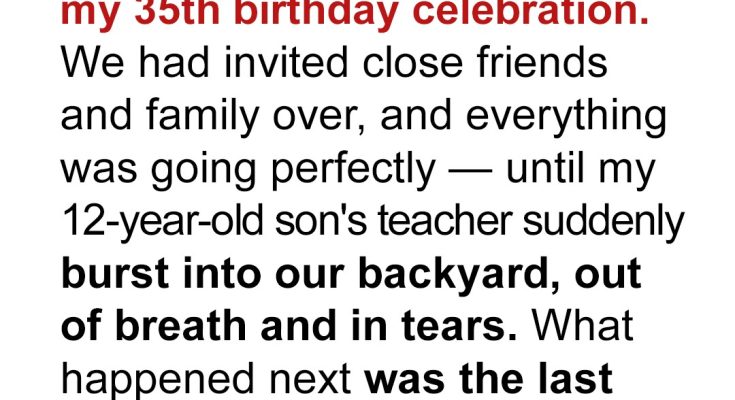 Music filled the yard, and someone handed me a slice of cake. I smiled and lifted my glass to make a toast. That’s when I heard the gate creak. A hush fell over the crowd as a woman stepped inside. She looked vaguely familiar. It took me a second to realize it was Mrs. Delgado — Ethan’s teacher.