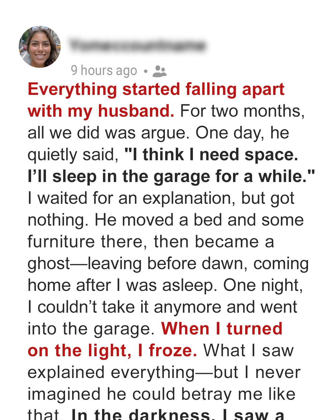 For months, my husband had been distant, slipping away like a stranger in our own home. One day, we argued, and he moved into the garage. But his late nights and cold silence gnawed at me. When I finally stepped into that garage unannounced, I uncovered a betrayal far worse than I imagined.Jake and I had only been married four years when everything started falling apart.For the past two months, it felt like all we did was fight and bicker.He couldn’t even meet my gaze across our kitchen table. The morning light would stream through our windows, catching the dust motes in its beam, and he’d stare right through them, through me, like I was already gone.“Pass the salt?” he’d mumble, eyes fixed on his plate.