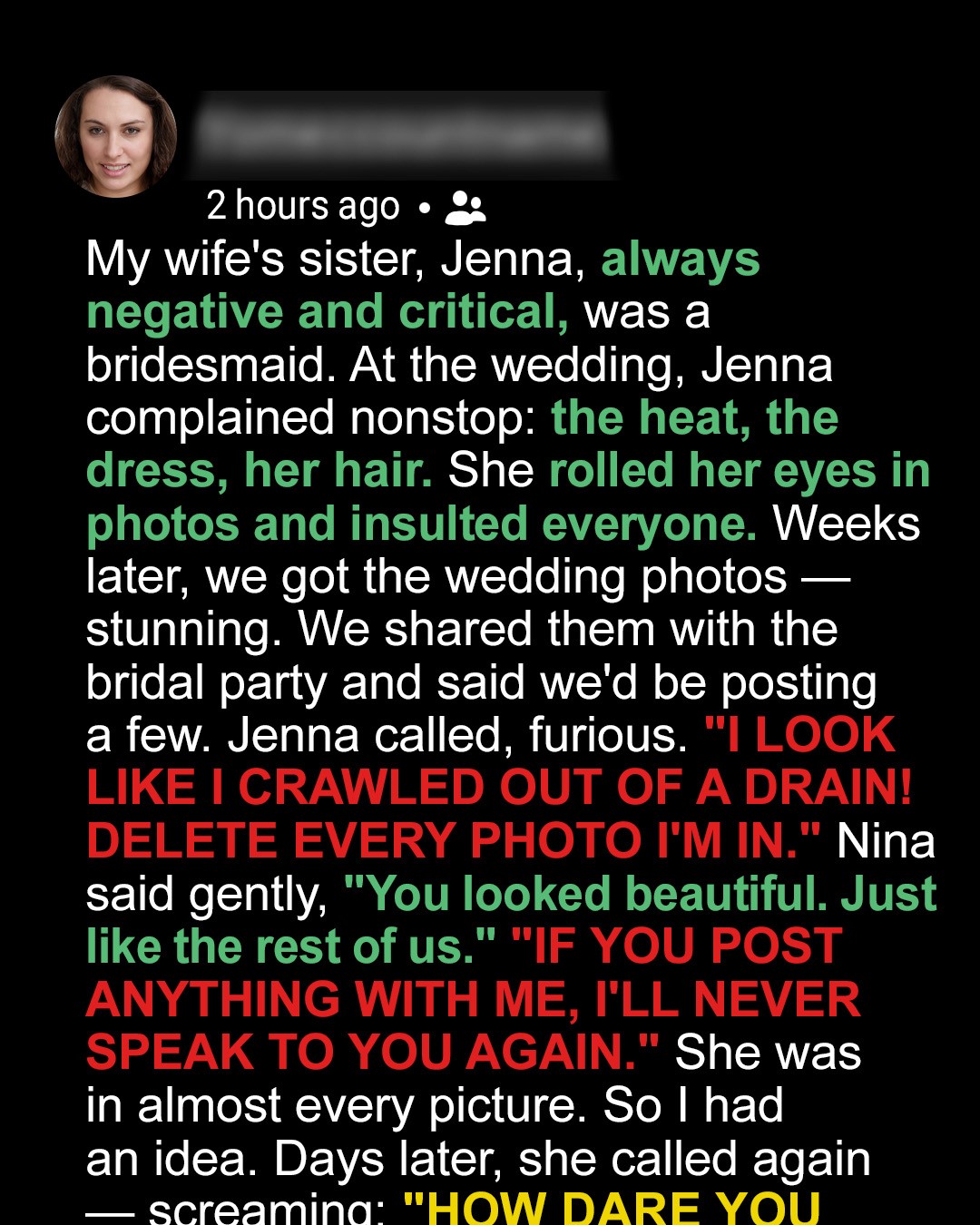“Are you blind?” Jenna’s voice was shrill, cutting. “My hair is frizzy, the dress makes me look fat, and in half the shots I’m squinting like I’ve never seen sunlight before!”