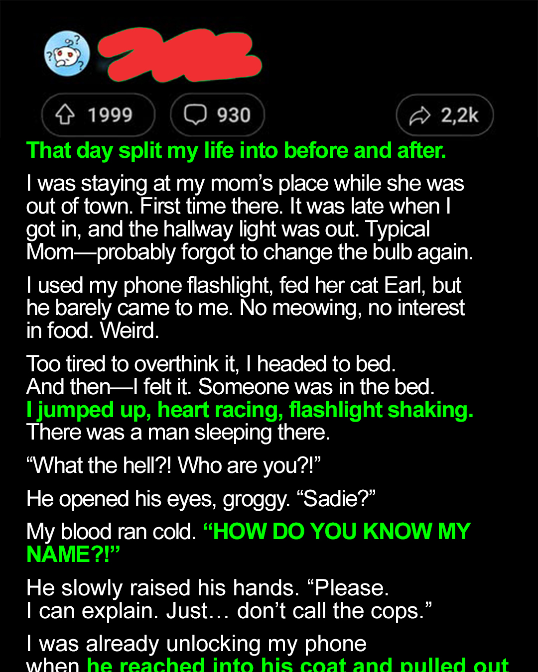 My mom was out of town. I came to water her plants, feed the cat, and sleep off a long day. But when I collapsed onto her bed, it wasn’t empty. A stranger was already in it—snoring. And when I screamed, he said my name like he’d known me forever.I stepped into the café just after six, the sky outside already wearing its evening blue like a worn-out coat.My feet ached, my shoulders sagged, and the smell of roasted beans hit me like a soft punch.After a day of standing, nodding, and saying “Sure, I’ll take care of it,” caffeine felt less like a choice and more like a need.Bonnie, my coworker, floated past me to the counter, already smiling at the barista. “Chamomile with a hint of peach, please,” she chirped.