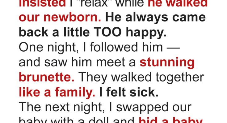 Motherhood had left me exhausted, and my husband seemed to understand. Every evening, he took our baby for a walk so I could relax, and it felt like a sweet gesture. I trusted him. But one night, he forgot his phone, so I followed his usual route to return it… only to realize it wasn’t usual at all.I gave birth to our baby boy, Caleb, six months ago. The transition to motherhood hit me like a freight train — beautiful and brutal in equal measure. The sleepless nights, the constant worry, and the overwhelming love made my chest ache. Through it all, my husband Nate seemed like my rock…