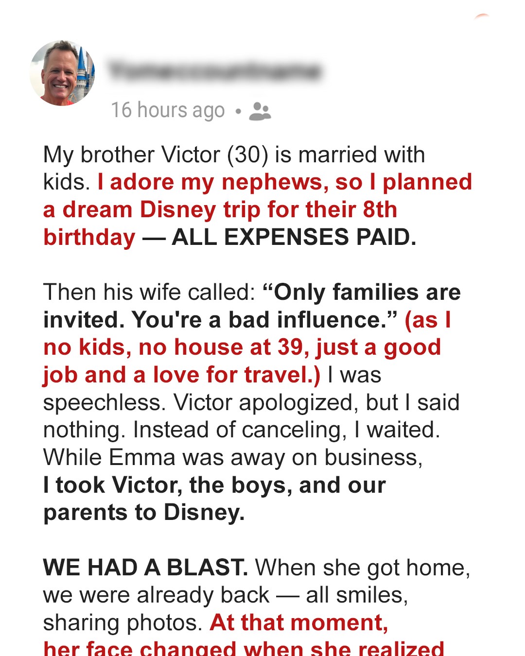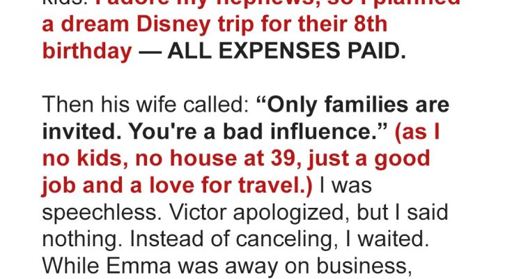 Bill surprises his nephews with a dream Disney trip, only to be excluded from their birthday party by his sister-in-law, Emma. But when she finds out that he took her family to Disney without her, all hell breaks loose. Now, Bill has one final truth to drop, and this time, Emma has to listen.If there’s one thing I love, it’s travel.No house, no kids, just me and my passport, and a career that lets me see the world. My younger brother, Victor, is the opposite. At 30, he’s a teacher, married, and is the father to two amazing twin boys.And those kids?