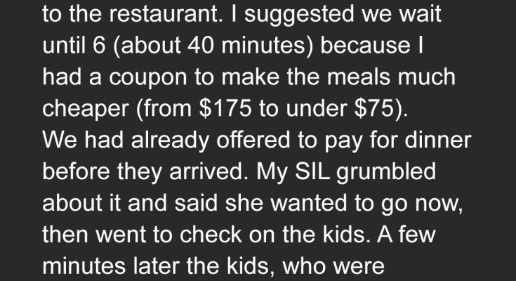 I offered to treat the whole family to dinner. My sister-in-law refused to wait 45 minutes, whining that her kids were “so hungry.” She dragged us out early… and I agreed, with a little plan up my sleeve that served her a full plate of reality and regret.The afternoon sun streamed through our kitchen window as I watched my eight-year-old nephew, Jake, carefully outline a rainbow with blue chalk on our patio. His little sister, Cindy, giggled beside him, her fingers already stained purple from her masterpiece.