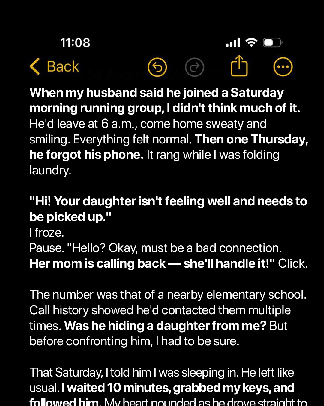 What if all this time, he already had a child? A little girl who needed to be picked up from school when she was sick? A daughter he visited every Saturday morning while I slept peacefully at home, thinking he was running miles with friends?