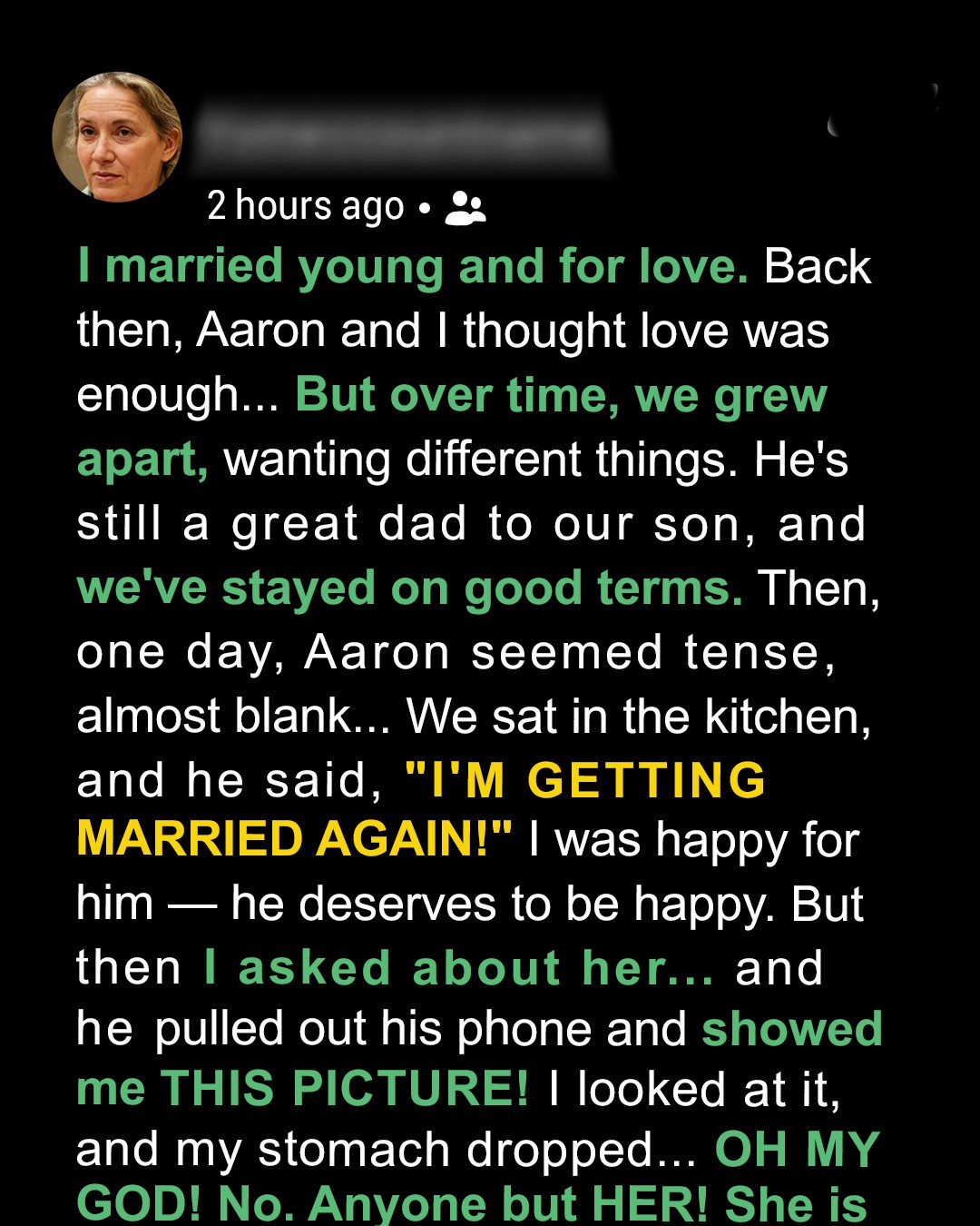 Aaron hesitated. Then, in one breath, he said, “I’m getting married again.”