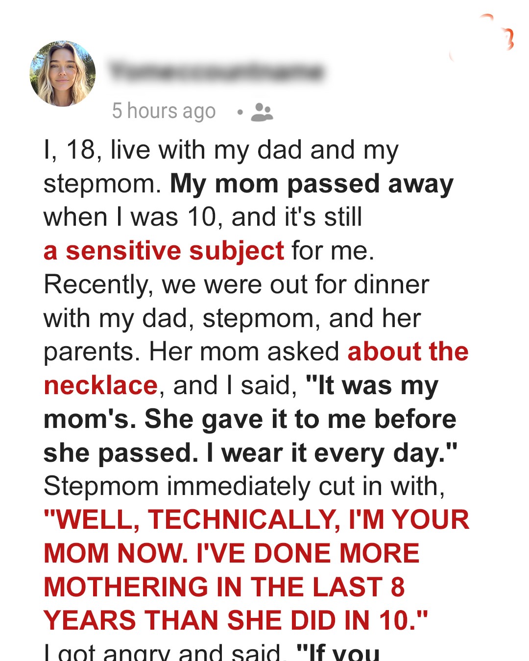 When Mia honors her late mother at a family dinner, her stepmother’s cruel outburst ignites a truth long buried. Forced to choose between silence and self-respect, Mia walks away and writes a letter that could shatter everything. This is a raw, unforgettable story about grief, memory, and what it takes to reclaim your voice.When my mom, Amelia, died, it felt like the sun got sucked out of our house.I was 10. One moment she was hugging me goodbye for school, the next, a car accident. It was sudden. Brutal. A hole blown clean through everything we knew.