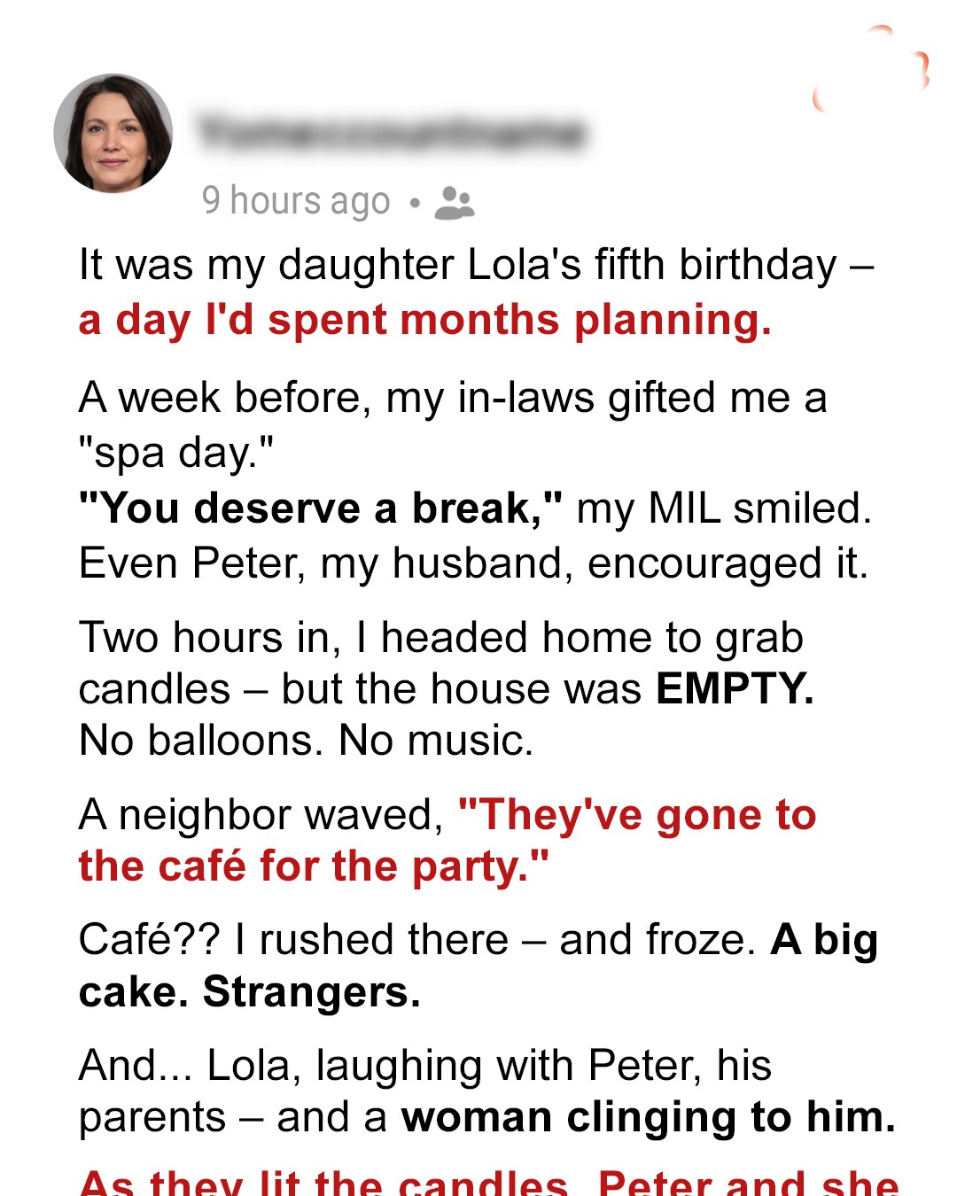 Kelsey thought her in-laws’ birthday gift, a relaxing spa day, was a rare moment of kindness. But when she comes home early, something feels off. The house is empty. Her daughter is gone. And what she finds next will unravel everything she thought she knew about loyalty, love, and family.On Lola’s fifth birthday, I was supposed to be at the spa, soaking in lavender-scented silence, sipping cucumber water, and feeling pampered.Instead, I was standing in the middle of a café filled with strangers, staring at my husband’s mistress blowing out birthday candles next to my daughter.