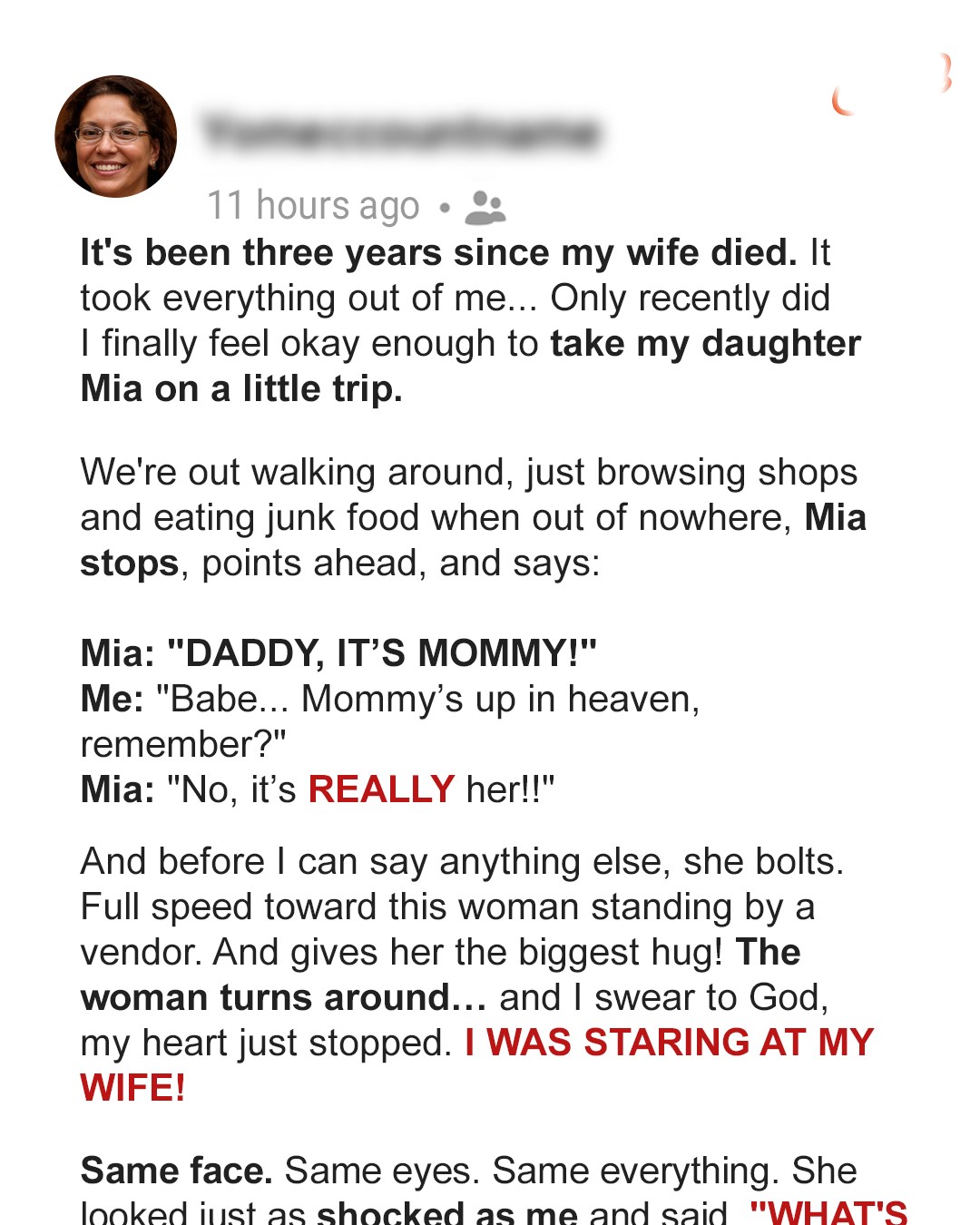 Mia, who still had her arms around the woman’s waist, cried triumphantly. “You see daddy, it IS mommy!”