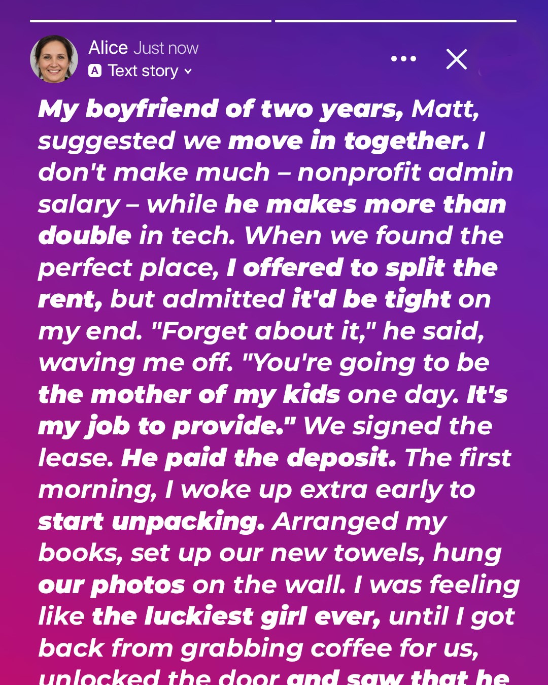 Soon, we found a cozy two-bedroom apartment with hardwood floors and a small balcony. Matt paid the deposit, signed the lease, and I started imagining our perfect little life together.
