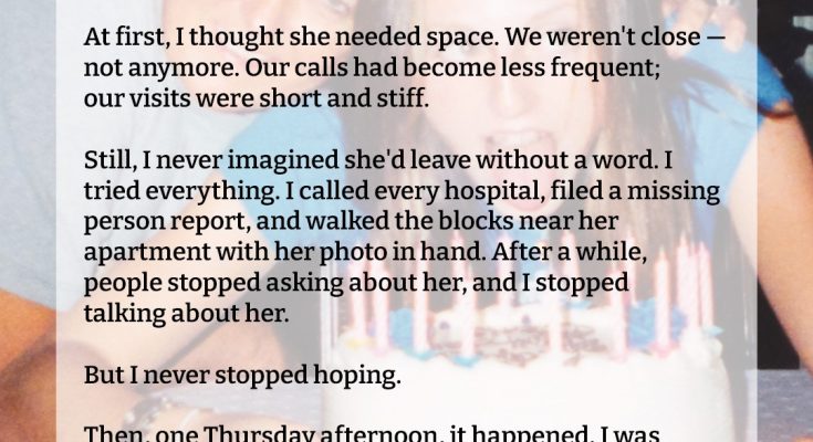At first, I thought she needed space. We weren’t close, not anymore. Our calls had become less frequent, our visits short and stiff. Still, I never imagined she’d leave without a word. I tried everything—called every hospital, filed a missing person report, walked the blocks near her apartment with her photo in hand. After a while, people stopped asking about her. I stopped talking about her.