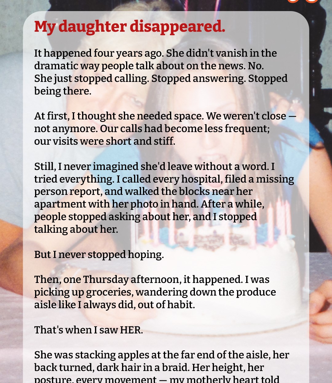 That night, we stayed in the cabin. We talked for hours, cried even longer. We spoke of the years we’d lost and the pieces we still had left. I told her I never stopped looking. She told me she never stopped missing me.