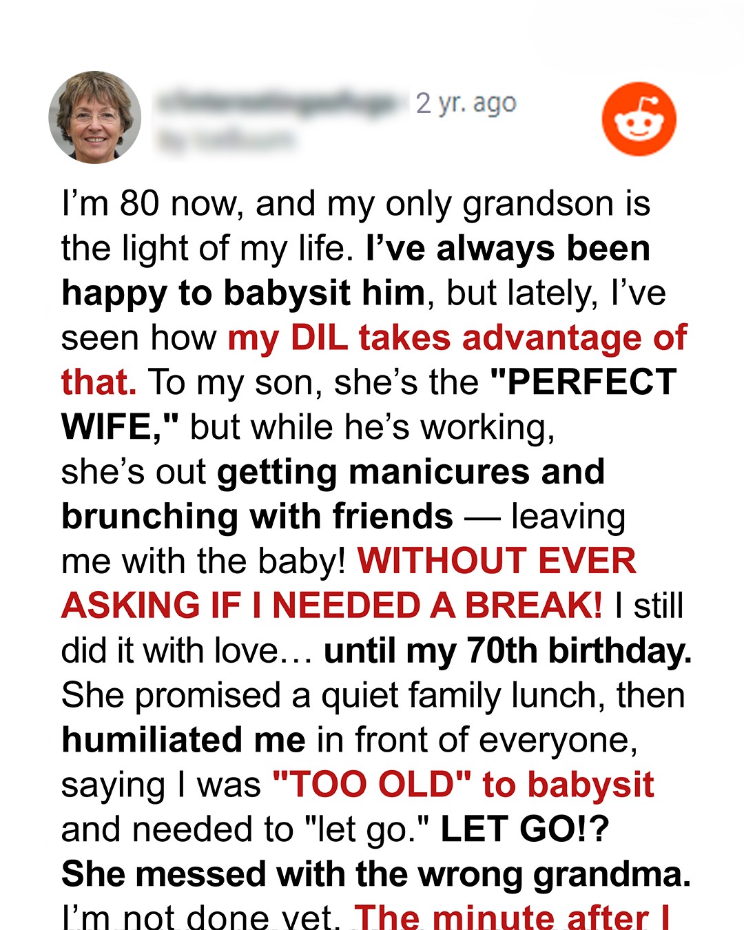 My DIL said I was too old to babysit, then tried to prove it at my own birthday picnic. But when my grandson disappeared, everyone finally saw what I’d been dealing with for years…I’ve always been the cool grandma. The kind who’s always on the move, who doesn’t know what “tired” or “day off” even means. I planned to live to a hundred and never slow down.Why? I still had a ton of ideas for that world!You could spot me at puppy yoga surrounded by college girls or skating at the park with twenty-something guys. I even learned Japanese only because I wanted to understand the writing on my grandson’s T-shirt.My young friends always found me fascinating.“Clementina, we’re hitting the pizza place tomorrow—coming with us?”