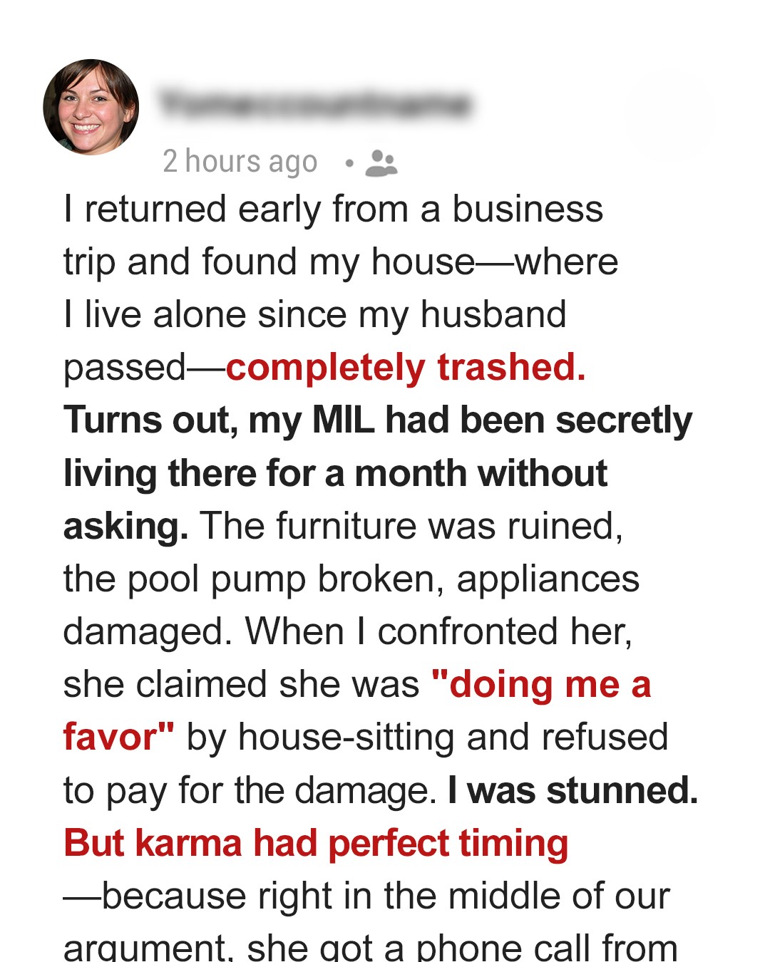 When Claire returns early from a business trip, she expects a quiet evening and an empty house. Instead, she arrives to chaos, and a confrontation with the one person who’s never respected her boundaries. What unfolds is a tale of grief, entitlement, and unexpected justice, as Claire learns that sometimes, the peace you reclaim comes at exactly the right cost.From the moment I married Daniel, I knew his mother, Margaret, didn’t see me as part of the family. It wasn’t subtle. She barely looked at me during our wedding, insisted on hosting holidays without asking if we had plans, and once called me Lorraine, his ex’s name, while claiming it was just a slip.