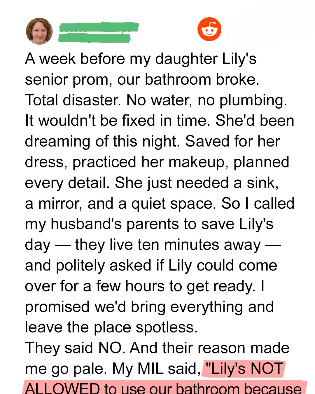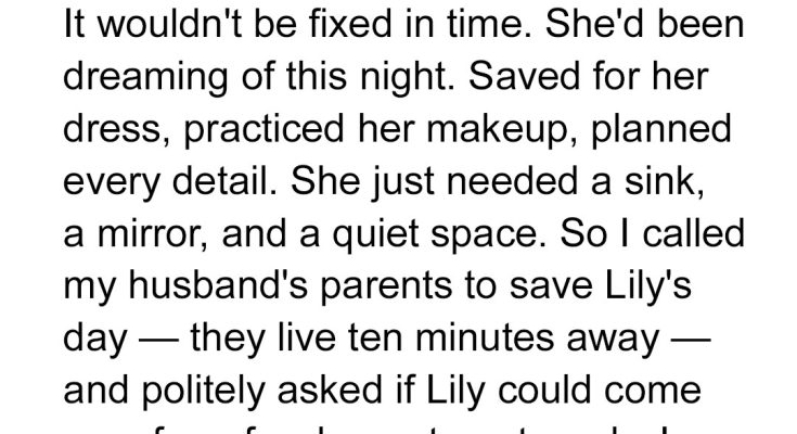 “Hi, Ellen,” I said, forcing cheer into my voice. “Quick favor… Lily’s prom is Friday, and with our plumbing situation—”